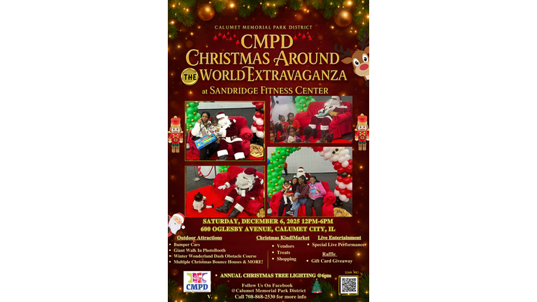 Calumet Memorial Park District hosts their Christmas Around the World Extravaganza today from noon-6pm at the Sandridge Fitness in Calumet City. The event is free for all and includes bumper cars, a winter wonderland obstacle course, bounce houses, vendors, treats, live performances, raffles and more! (See flyer below for all information.)