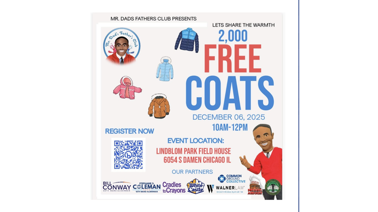 As temps drop, if you need a warm coat, Mr. Dads Fathers Club hosts their annual Share the Warmth Coat Giveaway today from 10am to 12pm. They'll give away 2000 coats at Lindbloom Park Fieldhouse, 6054 S. Damen Avenue in Chicago. You can register online to receive a coat and only one registration is allotted per family, plus children must be present to receive a coat.They will also provide free food for over 500 community members.